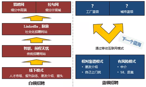 通過分析整個(gè)招聘行業(yè),我們看到白領(lǐng)招聘已經(jīng)互聯(lián)網(wǎng)化并進(jìn)入細(xì)分競爭階段。由于智能手機(jī)的普及,藍(lán)領(lǐng)招聘剛剛進(jìn)入移動(dòng)互聯(lián)網(wǎng)化的窗口期,尚未有成型的玩家出現(xiàn)。信息源:揭陽人才網(wǎng)_m.browseanswers.com