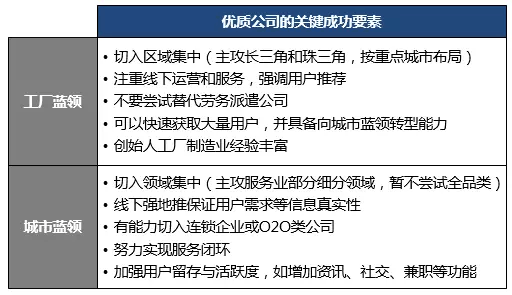 工廠藍(lán)領(lǐng)目前主要依靠線下勞務(wù)派遣公司,互聯(lián)網(wǎng)模式需要配合較強(qiáng)的線下運(yùn)營能力才可能切入,可以考慮的方向?yàn)椋?/p>